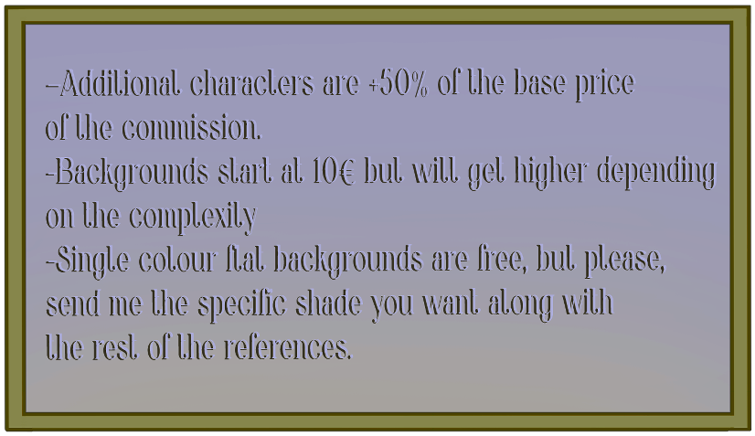 ✧Once we have discussed all the details, and i send you the sketch for approval, you will be allowed 2 free revisions. After that point any further revisions will be 5€ each. Please keep in mind that no revisions are allowed past the sketching phase.✧